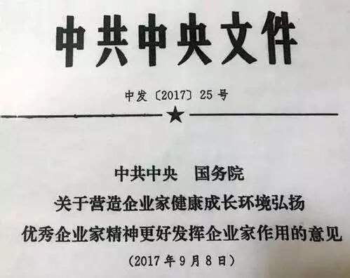 不到一年,2017年9月末,中央关于企业家精神的文件发布,中央首次高规格发文肯定企业家的价值和地位,并特别强调“营造依法保护企业家合法权益的法治环境”,提出要保护企业家的三大权益:企业家财产权、企业家创新权益、企业家自主经营权。