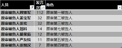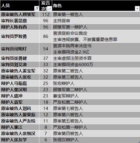被告人除顾雏军外,原审第二被告人姜宝军、第三被告张宏均发言32次;二人的辩护人发言次数略少于自己的当事人,分别为23次(盛冲)、25次(马振彪)。