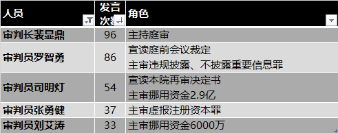 接下来是审判员罗智勇因为主持违规披露、不披露重要信息事实的审理以及宣读庭前会议裁定,有86次的发言,在几位主审法官之中,发言次数最多,也说明该部分事实法庭辩论较为集中。