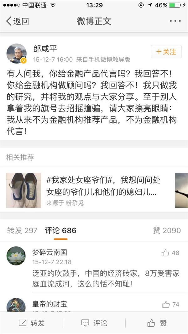 而他真正乐意做的,是为一些金融公司站台,拿钱,出事后翻脸不认人。